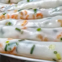 Thin, steamed rice rolls with flakes of mild, fresh sliced white fish, offering a clean and savory flavor profile.